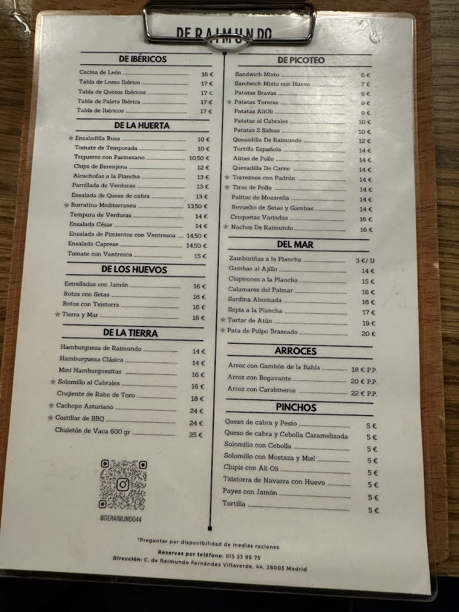 Welcome to De Raimundo Restaurante, a culinary gem nestled in the heart of Chamberí, Madrid. This establishment masterfully blends traditional Iberian tastes with a contemporary twist, offering a diverse menu brimming with mouthwatering selections. Begin your culinary journey with their delightful Tabla De Lomo Ibérico or savor the seasonal freshness of the Ensalada De Tomate De Temporada. For those looking to indulge, their cachopo has garnered rave reviews, praised for its rich flavors and hearty portions.